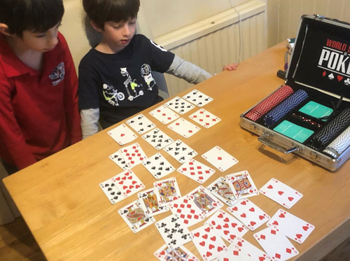 How to play: Lay out 7 hands as in the pic below — ace high/ 1-pair/ 2-pairs/ 3- of-a-kind/ straight/ flush / full house. Memorise. Takes 2 mins for them (took me ages when I learned at 16 for first time). Now turnover the cards facedown into 7 piles. Give 100 chips each. Everyone antes 5 chips then chooses a random pile. The dealer button rotates (take turns to go first basically). There is only 1 betting round, with players taking it in turn to go, rotating clockwise from the dealer. Each time it’s your go, you can check or bet as much as you like or fold. (Can’t check if facing a bet ahead of you and if you raise, it must be at least double previous bet). Play until each player is eliminated. Once they have the hang of this, you can introduce more betting rounds.